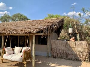 Ruaha offers an impressive selection of high quality small bush camps. We stayed at Kigelia Ruaha, part of the Nomad portfolio of camps. Kigelia has just a handful of tents strung out along the river bank with a thatched mess area with Wifi and bar at the centre. The tents are simple, spacious, well-designed and have everything you need including a large stand up fan, charging point and outdoor bucket shower. There’s a swing seat looking out over the river and all the tents had a bird bath out front which drew a daily crowd. Elephants visited camp on a couple of nights, rumbling behind our tent, as did hyenas who got into the bar and left a trail of smashed glasses and paw prints in their wake…
