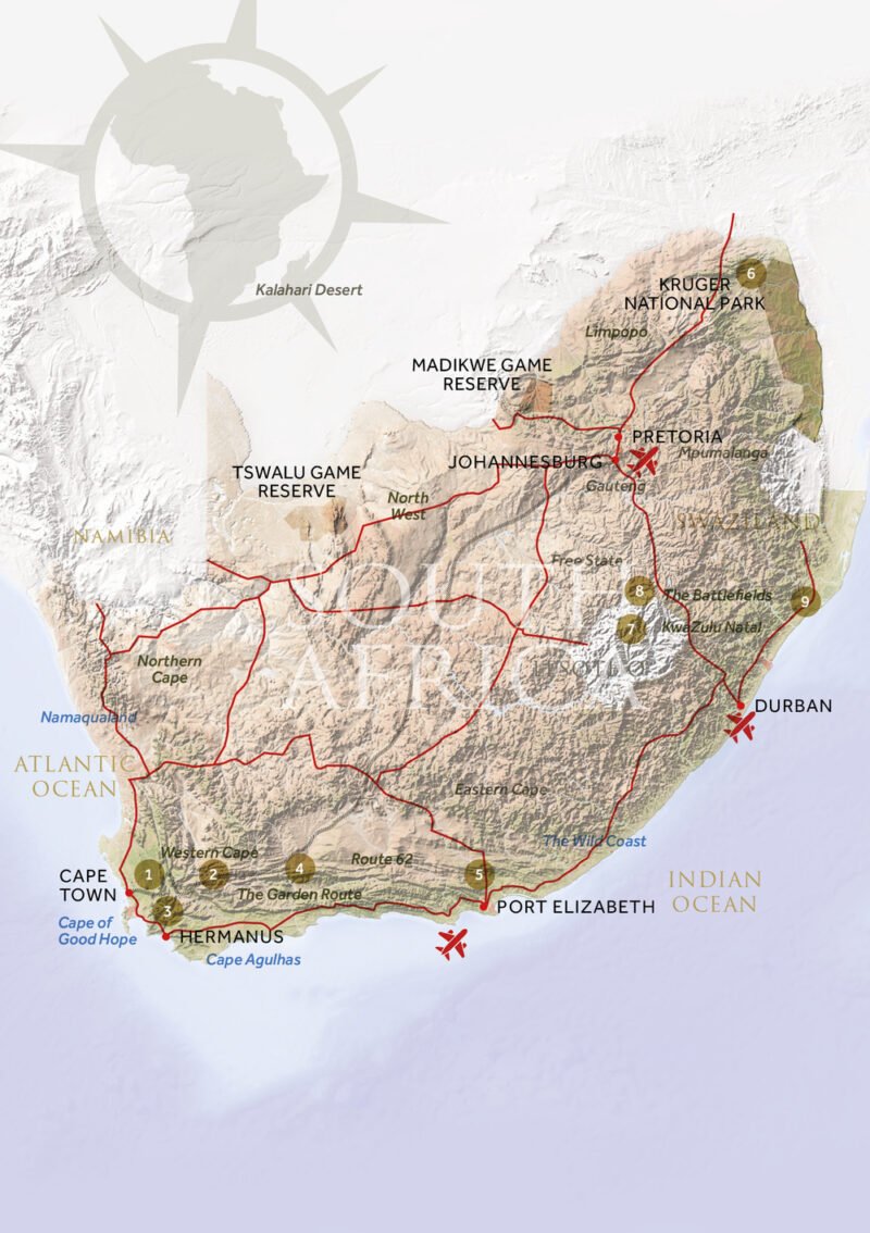 South Africa is an incredibly diverse holiday destination. You have one of the world’s most iconic cities in oceanside Cape Town, surrounded by rugged mountains, glorious vineyards and the sandy beaches of the Western Cape; you have the historic battlefields and world heritage wetlands of KwaZulu Natal further east while the wildlife rich plains of Kruger National Park, one of the best places to see the Big Five, lie to the north beyond the lofty Drakensberg Mountains. South Africa is undoubtedly a land for all people and all seasons.