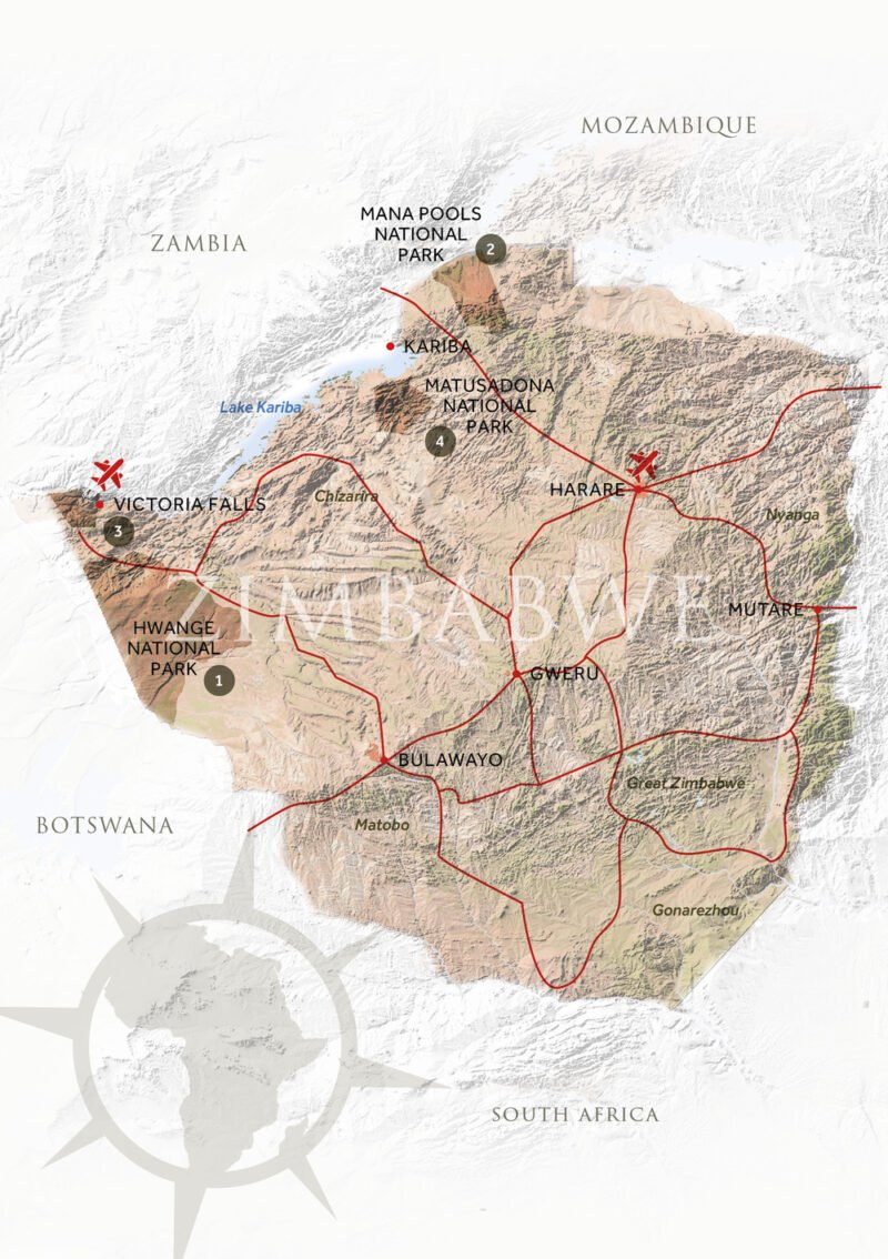 This land locked country is undoubtedly one of Southern Africa’s most stunning. Visitors here will be treated to exceptional guiding, magnificent wilderness and a bounty of natural and cultural riches. Whether you seek languid pools hosting vast herds of wildlife along the Zambezi, the thrill and adventure of booming Victoria Falls, or to wander amongst the ruins of Great Zimbabwe, looking beyond the headlines will reveal a country of immeasurable depth and beauty.