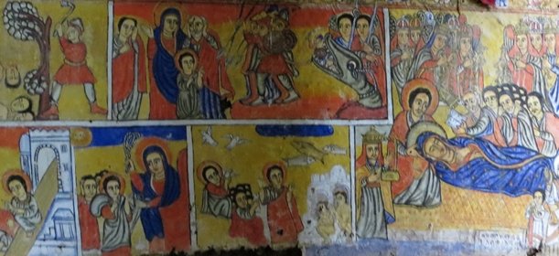 Finally reached Ura Kidane Mihret which ranks not only as the most impressive of the southern monasteries but also the most frequently visited church on the lake. The circular church was built in the 16th century and the interior walls are covered in an incredible jumble of murals, painted between 100 and 250 years ago. We were fascinated by the subject matter of many of the paintings, the colourful frescoes depicting biblical scenes and the history of the Ethiopian Orthodox Church many in very graphic detail. The colours were very bright being so well preserved in the dim light of the church. The monastery is an integral part of the local community.
