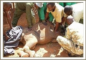 The entire stockade’s workforce and the Nairobi Keepers were all needed to help to get the new arrival restrained and on the ground in order to brace her legs and keep her safe and secure during the flight. With all hands on deck the calf showed huge amounts of strength in managing to evade being taken down, yet after a few minutes she succumbed to the keepers, whilst ex-orphan Emily bellowed and stomped around the stockades concerned about what was happening to her.