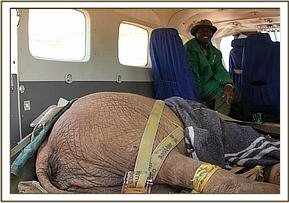 The calf was quite a weight and again all hands were needed to lift her into the waiting vehicle and to get her to the airstrip. The transfer went smoothly and within half an hour the calf was being lifted into the plane, strapped securely inside with an IV drip administered to ensure she stayed hydrated during the flight, and a mild sedation to keep her calm.