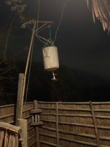 Water is heated by solar power (or charcoal) to a comfortable showering temperture. Water heated by charcoal has a distinct aroma! The team fill the bucket for you and let you know when it is ready. There is a simple tap/lever that you turn to make the water flow. Buckets vary in size – from 20-40 litres. The best tactic is to turn off the water while you soap up or wash your hair and then turn it on again to rinse. A 40 litre bucket provides plenty of water for two people showering in this way.